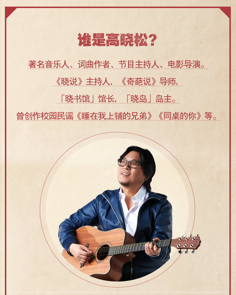 你将获得在:1、1500分钟历历在目的穿越之旅;2、50年的时代精彩记忆;3、50岁后回望半生高晓松式经验;4、横跨文娱政经、贯通中西世界的知识盛宴;5、和历史和时空和人生真正的共振;6、52期特别年代节目——《请回答》系列,邀请相关年份事件的名人大咖在场畅聊,拓展更多话题,透露当年更多细节,全面呈现当时的社会全貌。