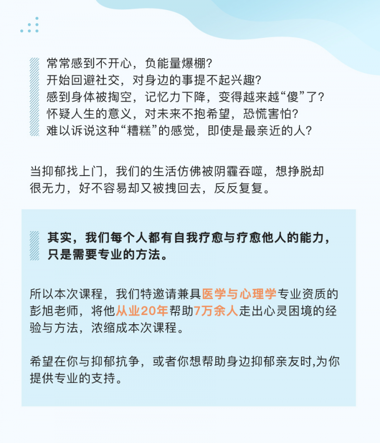 我是彭旭,北京心理危机研究和预防中心副主任医师,也是一名有20多年经验的心理治疗师,先后帮助了7万多人走出心灵困境。